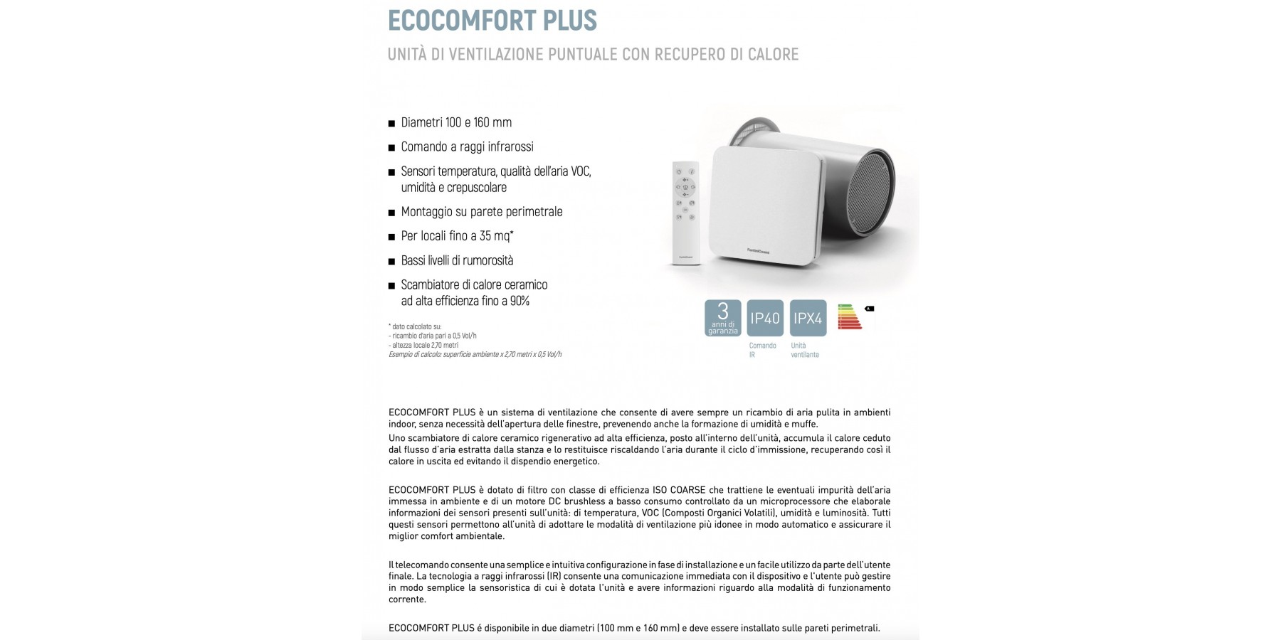 ECOCOMFORT PLUS DIAMETRO 100 è un sistema di ventilazione che consente di avere sempre un ricambio di aria pulita in ambienti indoor, senza necessità dell’apertura delle finestre, prevenendo anche la formazione di umidità e muffe.