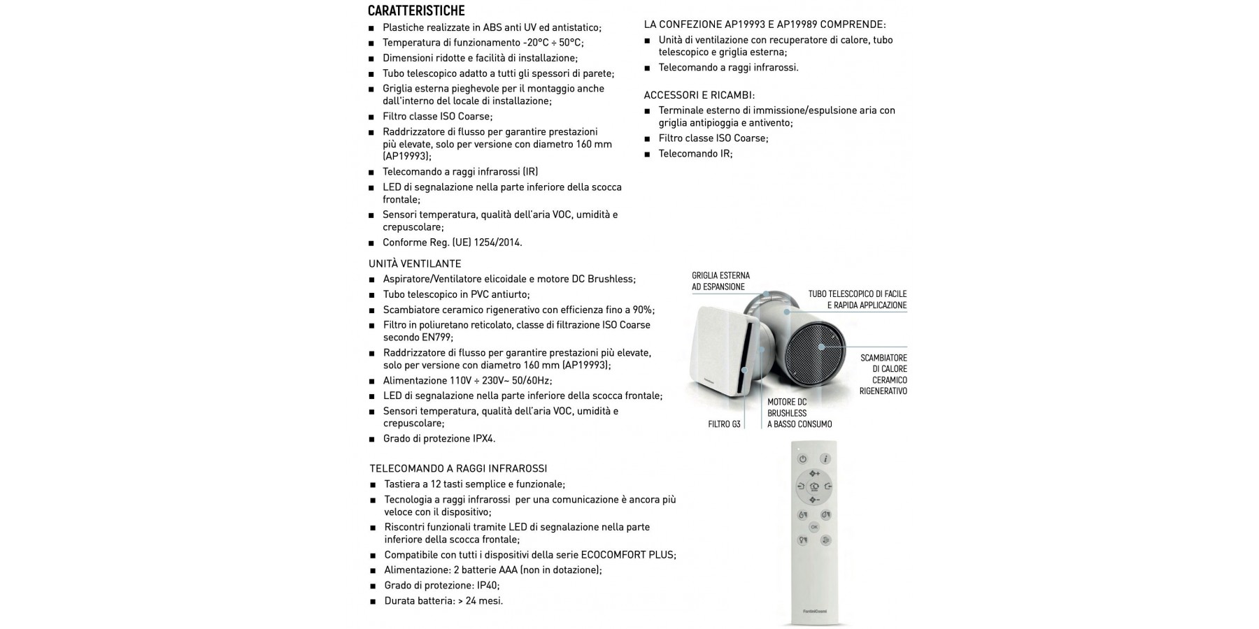 ECOCOMFORT PLUS è dotato di filtro con classe di efficienza ISO COARSE che trattiene le eventuali impurità dell’aria immessa in ambiente e di un motore DC brushless a basso consumo controllato da un microprocessore che elaborale informazioni dei sensori presenti sull’unità: di temperatura, VOC (Composti Organici Volatili), umidità e luminosità. Tutti questi sensori permettono all’unità di adottare le modalità di ventilazione più idonee in modo automatico e assicurare il miglior comfort ambientale.