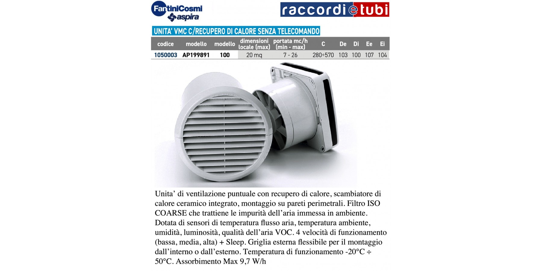 Unita’ di ventilazione puntuale con recupero di calore, scambiatore di calore ceramico integrato, montaggio su pareti perimetrali. Filtro ISO COARSE che trattiene le impurità dell’aria immessa in ambiente. Dotata di sensori di temperatura flusso aria, temperatura ambiente, umidità, luminosità, qualità dell’aria VOC. 4 velocità di funzionamento (bassa, media, alta) + Sleep. Griglia esterna flessibile per il montaggio dall’interno o dall’esterno. Temperatura di funzionamento -20°C ÷ 50°C. Assorbimento Max 9,7 W/h