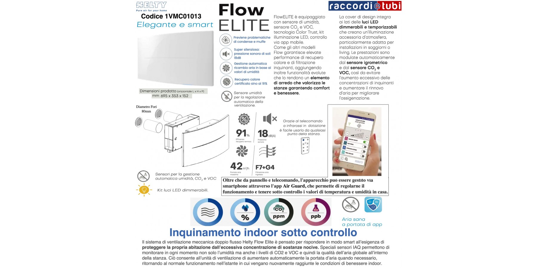 FlowELITE è equipaggiato con sensore di umidità, sensore CO2 e VOC, tecnologia Color Trust, kit illuminazione LED, controllo via app mobile.